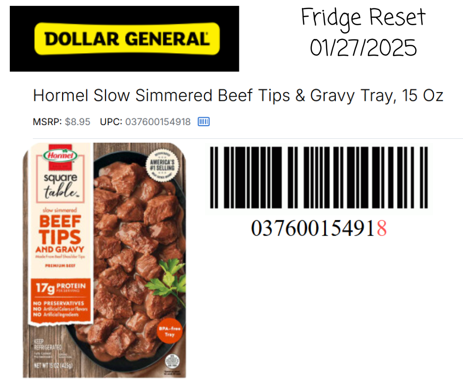 - Hormel Beef Tips Fully Cooked Entree 15oz – UPC: 0376-0015-4918