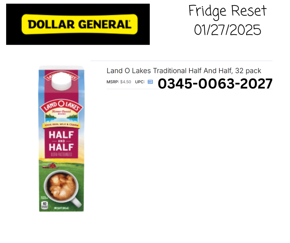 - Land O Lakes Half & Half ESL 32oz – UPC: 0345-0063-2027