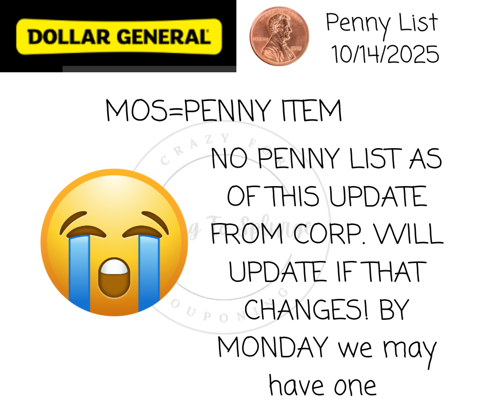 Here is your current Dollar General Penny List Tuesday, October 14, 2025 (10/14/2025) The penny lists have been coming separate with the new systems and there was an announcement of a seasonal clearance event so when the info comes out on a penny list we will updated.