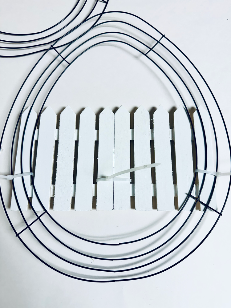 Once the fence pieces are dry, zip tie them together (I used a clear one for this) and then zip tie the ends to the wreath form.