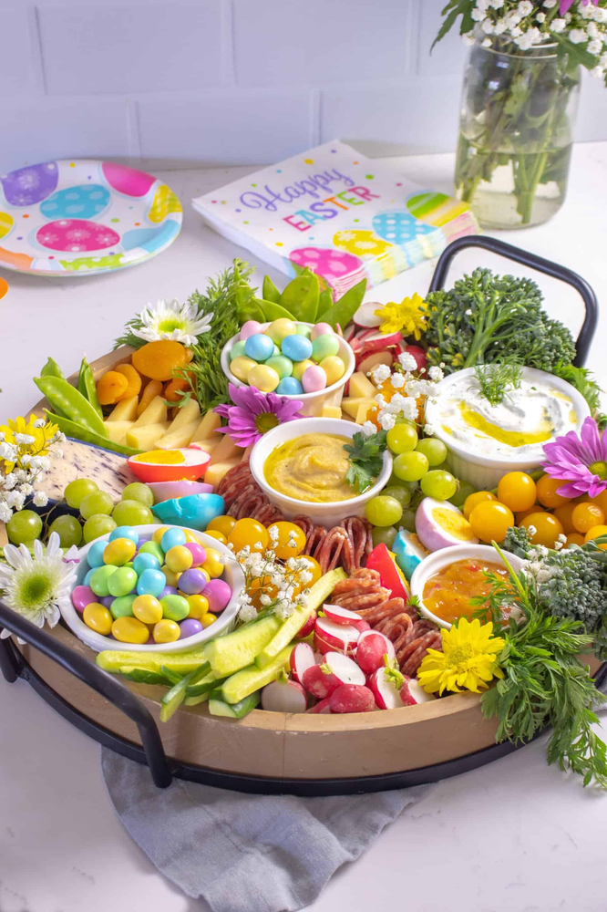 This Easter Charcuterie Board is a fun and bright appetizer platter to serve in the spring. It is made with fresh vegetables, some Easter candy and lots of pretty flowers for pops of color. It's perfect for serving for brunch in the springtime when veggies and fruits are in season.