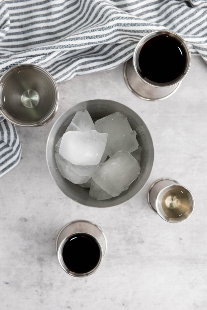 · Fill a cocktail shaker with ice.