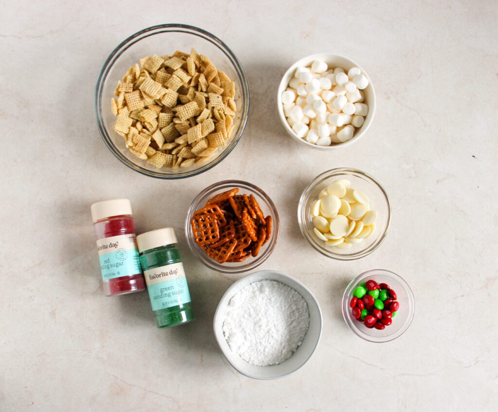 - Christmas Puppy Chow: In a large bowl, mix Rice Chex, mini marshmallows, and pretzels. Melt white chocolate and drizzle over the mixture. Spread onto a parchment-lined baking sheet and sprinkle red and green sanding sugar and powdered sugar on top. Add M&Ms once set.