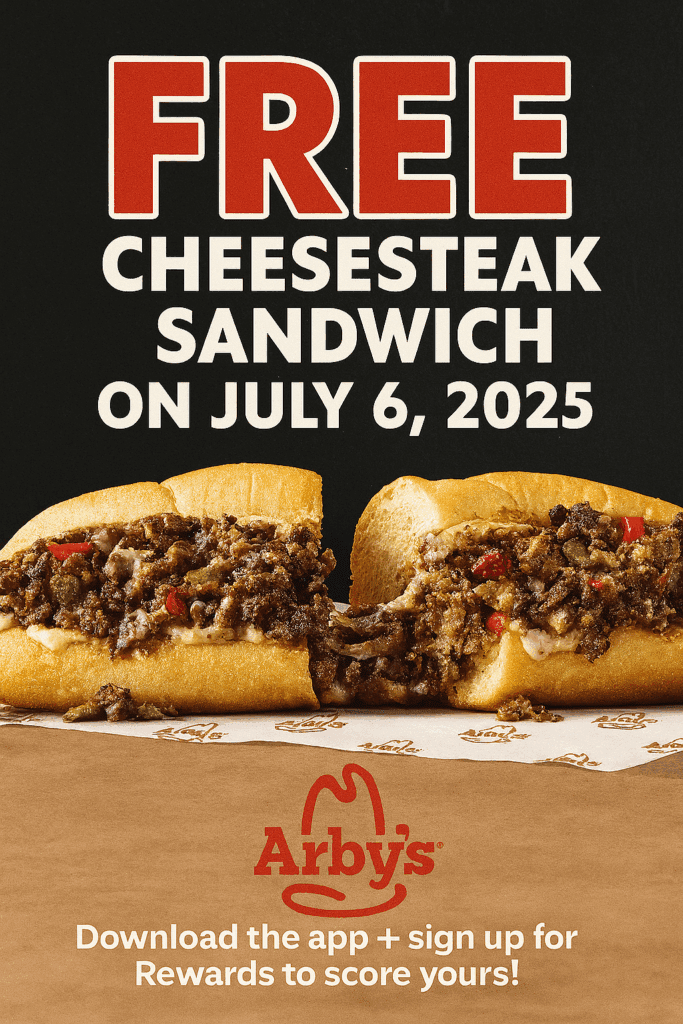 Calling all Arby’s lovers — this deal is for YOU! If you’ve been craving a juicy, cheesy, flavor-packed Cheesesteak Sandwich, get ready to mark your calendars! 🗓️ Check out On July 6th, 2025, Arby’s is giving away FREE Cheesesteak Sandwiches to the first 100,000 Rewards Members — all you have to do is make a purchase of $10 or more and claim the deal in the Arby’s app!