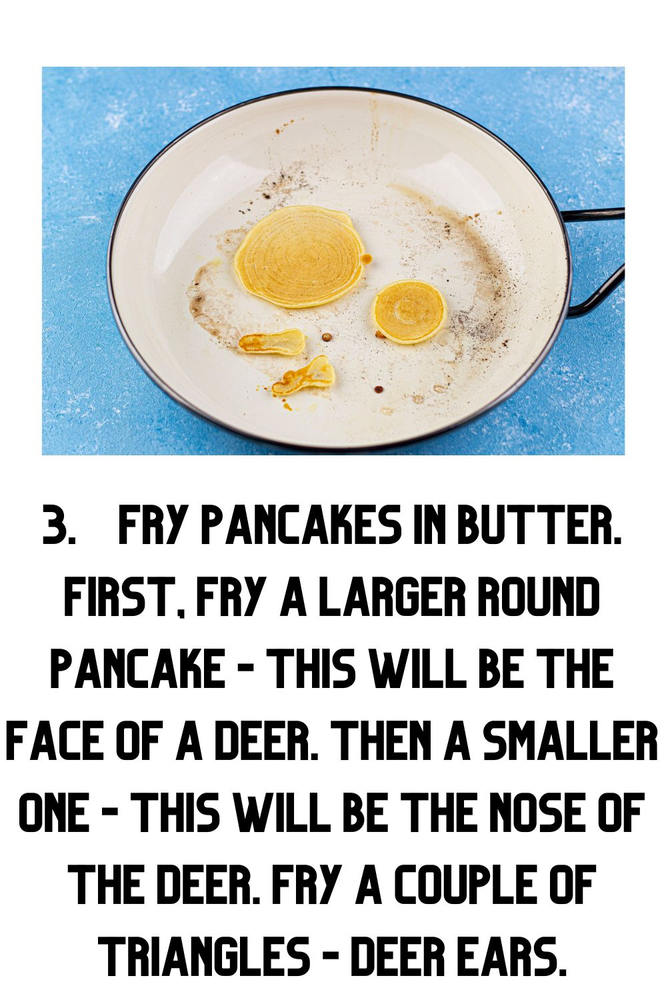 3. Fry pancakes in butter. First, fry a larger round pancake – this will be the face of a deer. Then a smaller one – this will be the nose of the deer. Fry a couple of triangles – deer ears.
