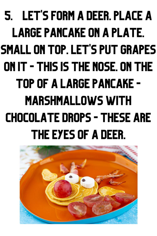 5. Let's form a deer. Place a large pancake on a plate. Small on top. Let's put grapes on it – this is the nose. On the top of a large pancake – marshmallows with chocolate drops – these are the eyes of a deer.
