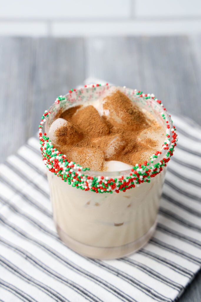 1. Prepare the Glass: Start by adding white icing to the rim of your glass. Roll the rim in Christmas sprinkles to coat it generously. This will give your cocktail a fun, colorful touch and a little extra sweetness.