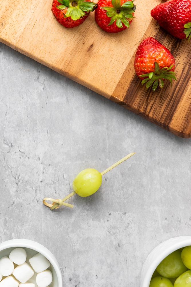 • Start by threading a green grape onto each toothpick or small skewer. This will be the Grinch's head.