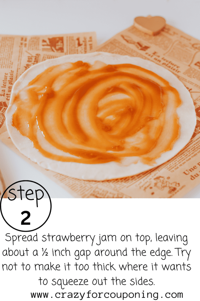 2. Spread strawberry jam on top, leaving about a ½ inch gap around the edge. Try not to make it too thick where it wants to squeeze out the sides.