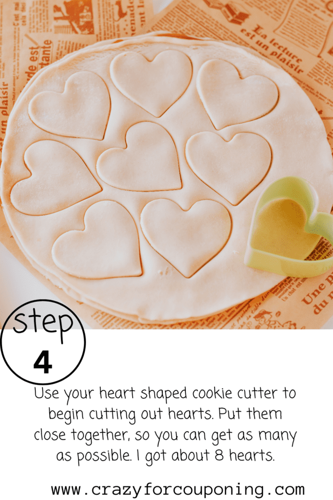 4. Use your heart shaped cookie cutter to begin cutting out hearts. Put them close together, so you can get as many as possible. I got about 8 hearts.