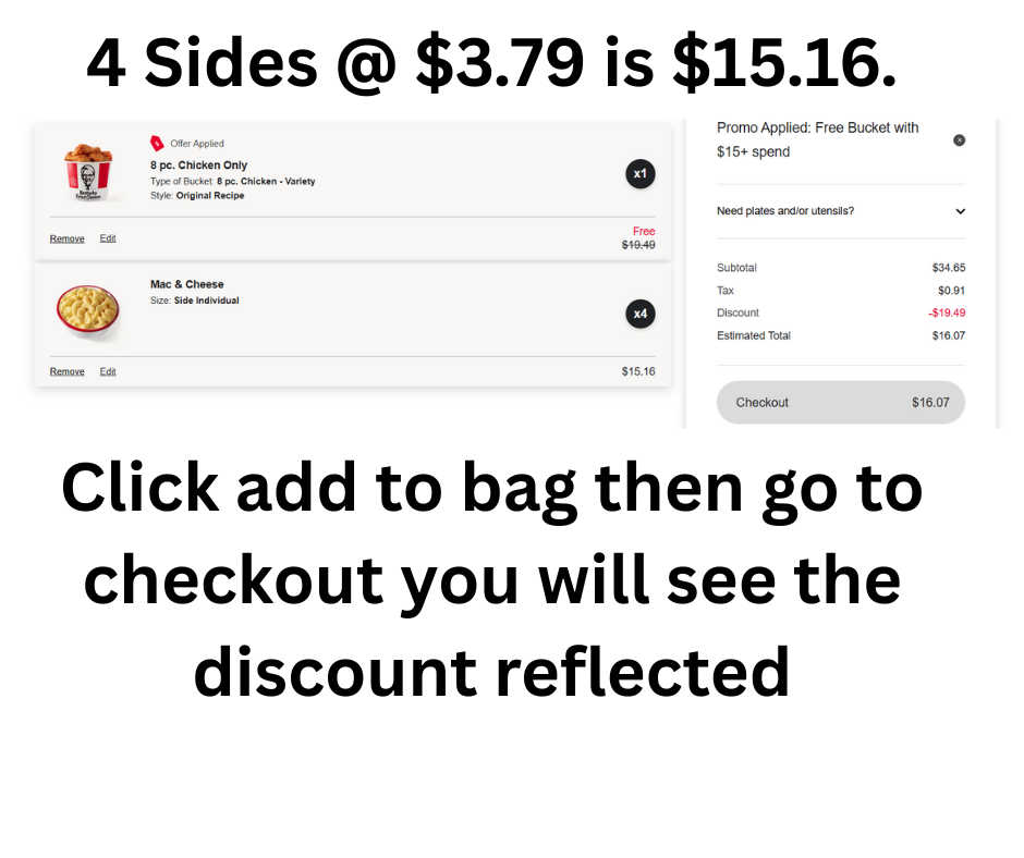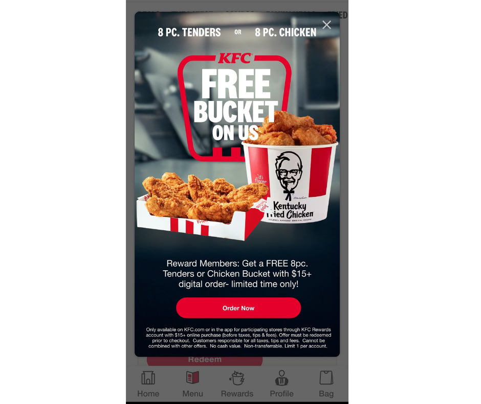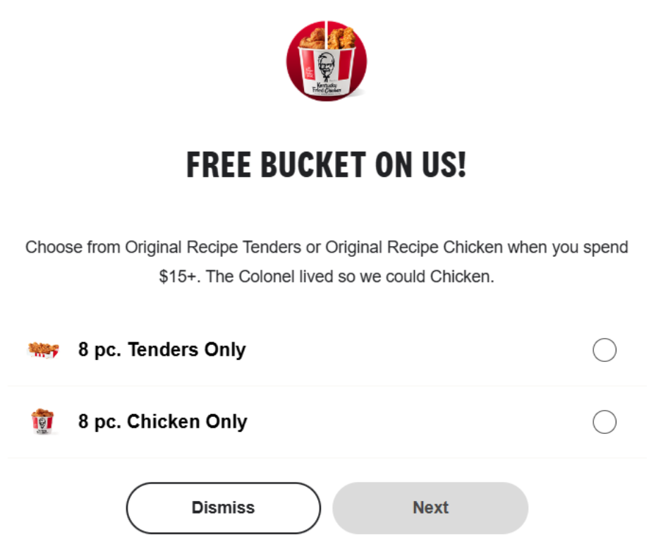 - Select your FREE 8-piece chicken bucket or tenders reward before checkout