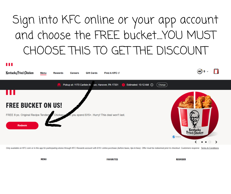 - Redeem the offer on KFC.com or in the KFC App at participating locations.