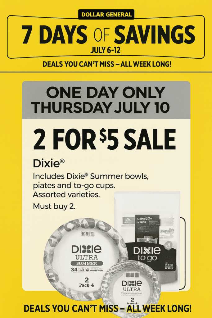 As we round out the week, Dollar General has a deal that’s perfect for summer entertaining. On Thursday, July 10, snag a great bundle offer on Dixie Summer Plates, Bowls, and To-Go Cups. Mix and match these items in a 2 for $5 deal. With regular prices between $3.75 and $4.25, you’re saving up to $3.50 on this bundle. It’s an excellent opportunity to stock up on party essentials.