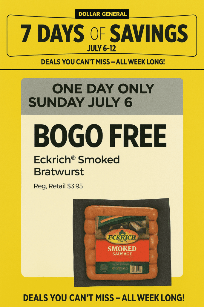 Kick off your week of savings on Sunday, July 6, with a sizzling deal on Eckrich Smoked Bratwurst. Buy one pack at the regular price of $3.95, and you’ll get another pack absolutely free! This BOGO offer is perfect for summer grilling or stocking your freezer for future cookouts. Don’t miss this chance to double your bratwurst without doubling your spending.