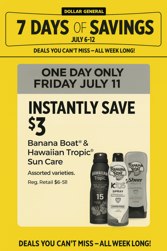 As summer heats up, Dollar General’s got you covered with deals on sun protection and cooling solutions. On Friday, July 11, save instantly on Banana Boat and Hawaiian Tropic sun care products. You’ll get $3 off these trusted brands, with regular prices ranging from $6 to $11. It’s the perfect time to stock up on sunscreen for your beach days or backyard barbecues.