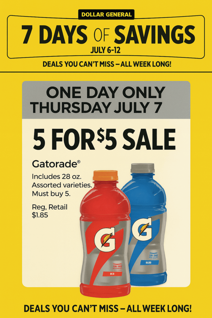 Quench your thirst and satisfy your hunger with these unmissable offers. On Monday, July 7, Dollar General is offering a Gatorade discount that’ll keep you hydrated all summer long. Grab five 28 oz Gatorade bottles for just $5 – that’s only $1 per bottle, down from the regular price of $1.85 each. Remember, you must buy five to get this deal, so stock up while you can!