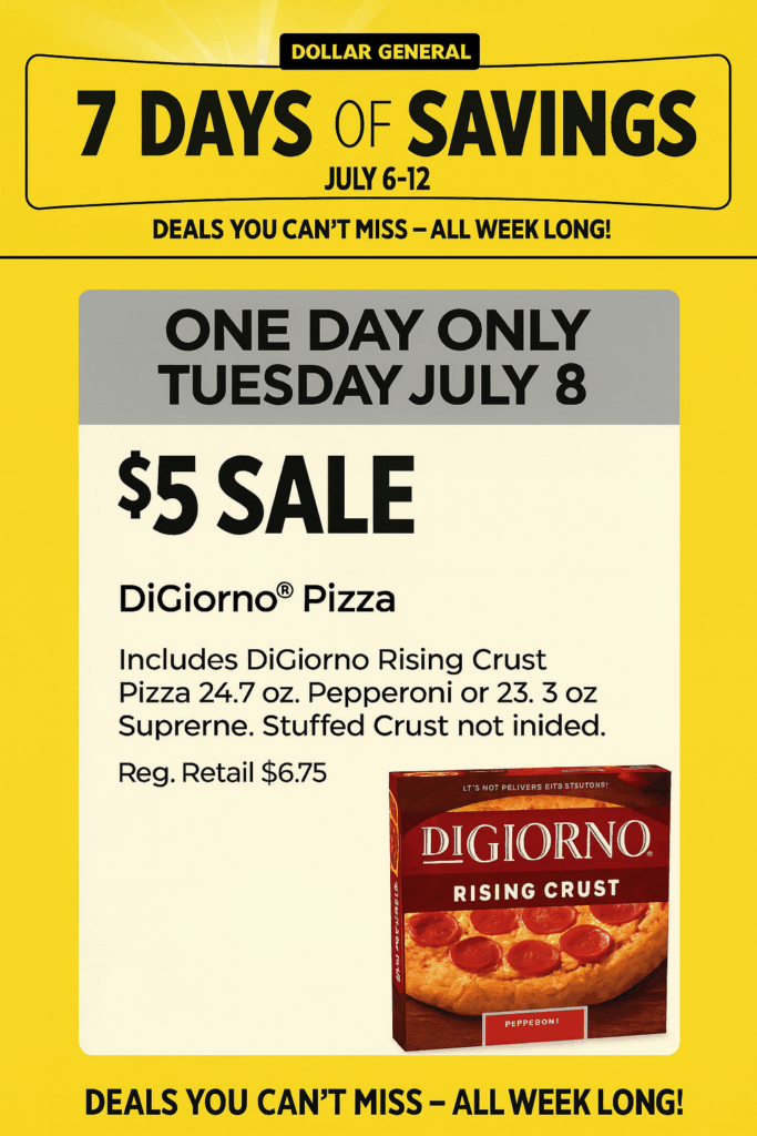 Looking for a quick and delicious dinner option? Tuesday, July 8, brings a DiGiorno pizza sale that’s perfect for busy weeknights or lazy weekends. Pick up select varieties of DiGiorno pizza for only $5, down from the regular price of $6.75.