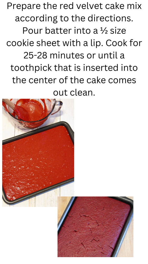 2. Prepare the red velvet cake mix according to the directions. Pour batter into a 1⁄2 size