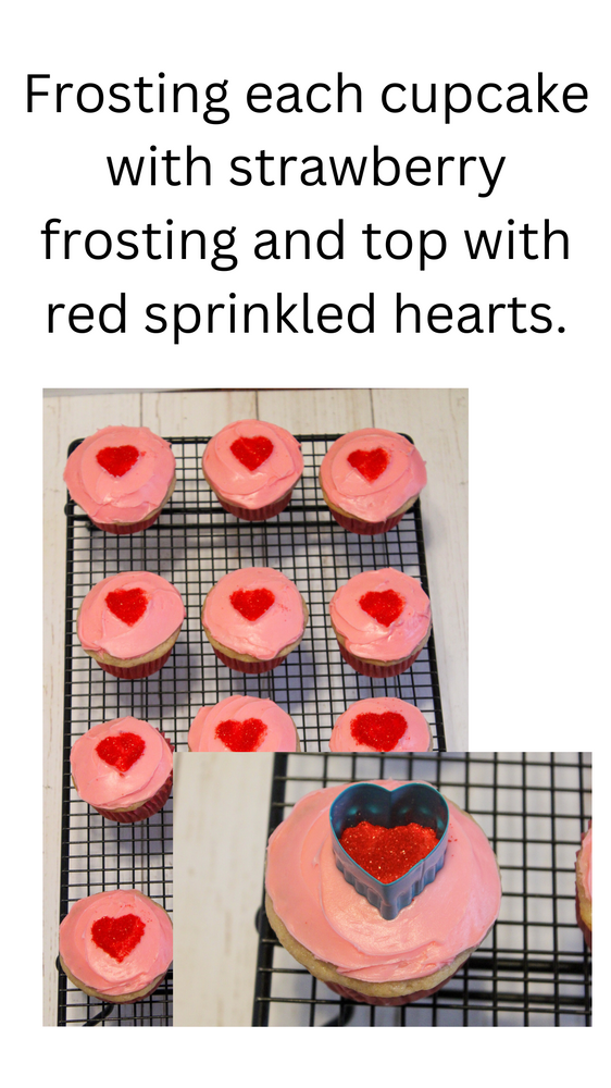 8. Frosting each cupcake with strawberry frosting and top with red sprinkled hearts.