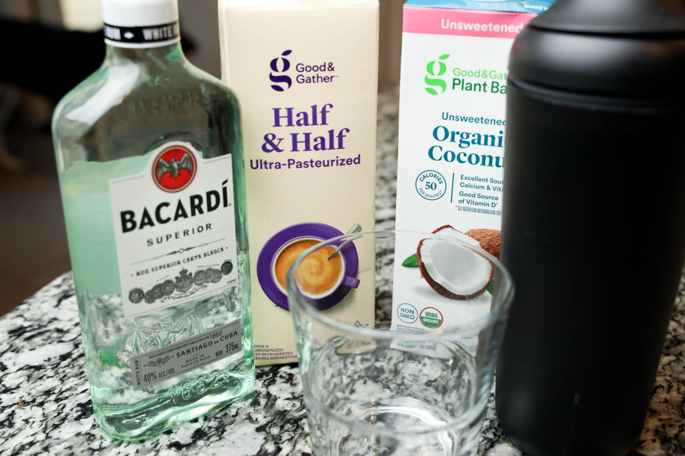 In a shaker, add in coconut milk, half and half, ice, and rum. Shake well.