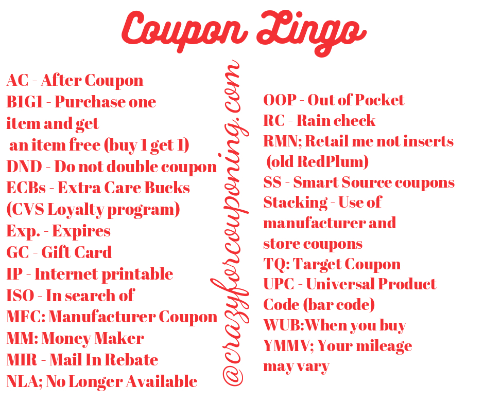 Now that you know how to read the coupons itself, there is a lot of coupon lingo that people use when posting. Here is a chart to make it easy for you to understand and remember what they are saying.