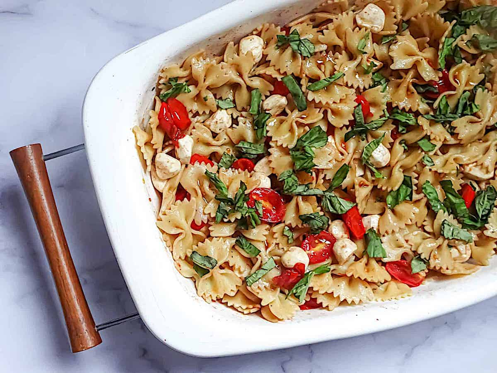 An easy Caprese Pasta Salad recipe that makes a quick bbq side dish or an appetizer for any party. Caprese Pasta Salad is made with pasta, fresh grape tomatoes, fresh mozzarella, and fresh basil. It's tossed with a simple balsamic and olive oil dressing and sprinkled with salt and black pepper. It's light and refreshing and loved by both kids and adults!