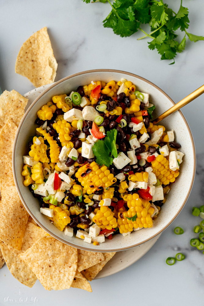 This dip has everything in it for a tasty offering at your Memorial Day party. Made with corn, black beans, feta cheese and red pepper, the dressing is light so the veggies can bring the flavor of summer.