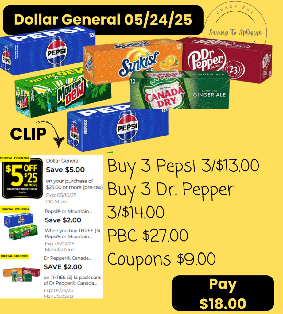 Big soda savings are popping off this Saturday, May 24, 2025, at Dollar General! If you’re a fan of Pepsi, Mountain Dew, Dr Pepper, Sunkist, 7UP, Canada Dry, A&W, or RC Cola, this is your sign to stock up.