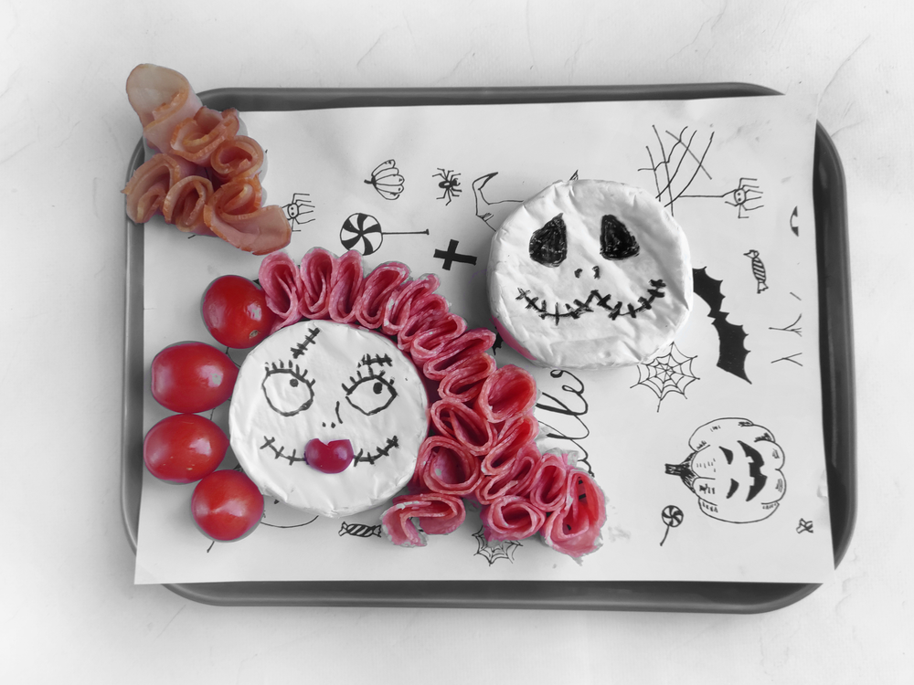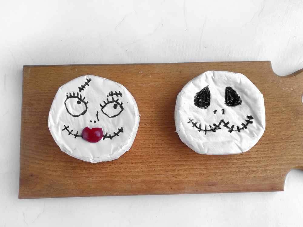 2. Unwrap the brie cheese and lay it out on a board.  You won't need any special artistic talent to draw Jack's face. It's very simple. Two triangular black eyes, two dots – a nose and a scarred mouth. Sally will take a little more time draw the eyes with eyelashes, nose scars and smile. Stack the pitted cherry by placing it in the center of the smile.