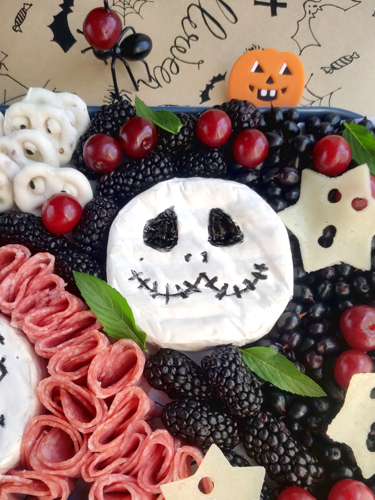 A skeleton style board with Halloween characters Jack and Sally will be appreciated by fans of the cult movie The Nightmare Before Christmas. The recipe is simple and allows for improvisation. The base of the Jack and Sally board is made of a small-sized round cheese. All parts of the face are drawn with a black colored food marker. If you don't have a food marker, you can draw the parts of the face with black food coloring using a cotton swab or a clean brush. We will be making Sally's curls out of salami and cocktail tomatoes. For the board we will use pretzels covered with white chocolate in the form of ghosts. They will contrast perfectly with black berries – blackberries, black currants and blueberries. Put out some “blood” from cherries or raspberries to add to the creepiness.