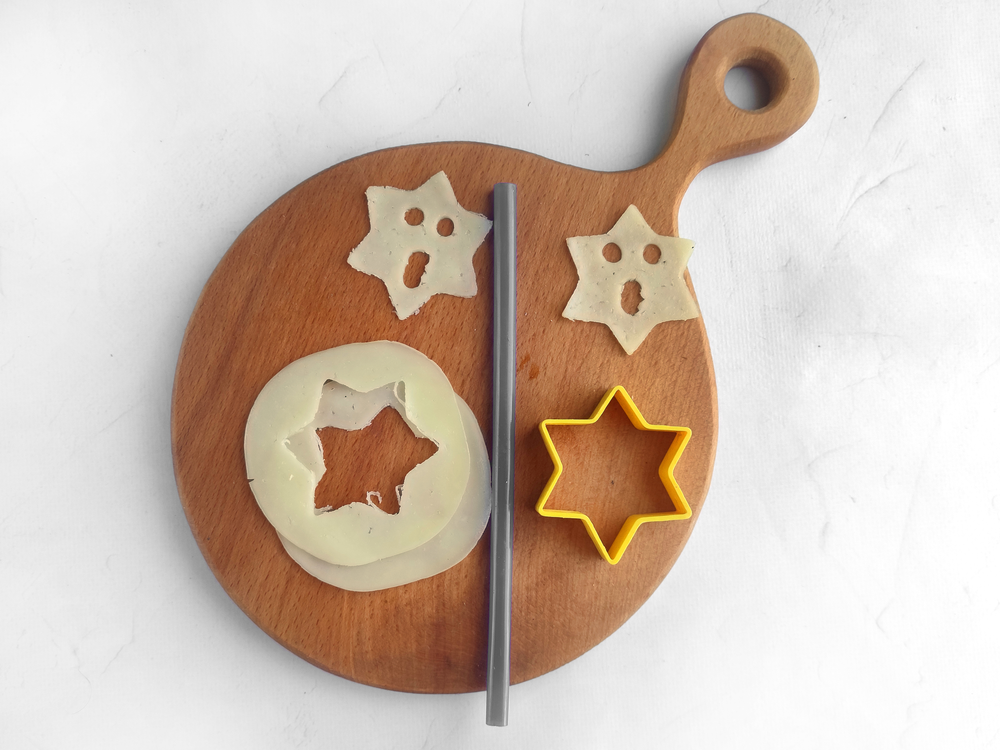 1. Prepare the ghosts from cheese. To do this, use a star cookie cutter to decorate the body of the ghosts. With the help of a cocktail straw form the eyes and mouth. The ghosts are ready.