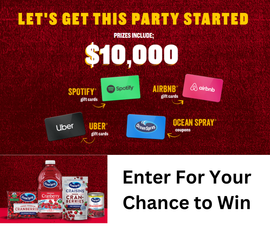 How to Enter: To play, purchase any three (3) Ocean Spray(R) products in a single transaction and upload your receipt to www.scanjigglewin.com. To play without purchase, send a self-addressed stamped envelope to: Ocean Spray Scan Jiggle Win, c/o Brandmovers, Inc., 1519 Carroll Drive, Atlanta, GA 30318, to be postmarked by 12/31/2023. NO PURCHASE NECESSARY. Limit one entry per person per day. Prizes available only while supplies last. Open to residents of the 50 United States and D.C., 18+ (or 19 for residents of AL & NE) as of the date the contest begins, except for employees of Ocean Spray Cranberries, Inc. and Brandmovers, Inc. and members of their immediate families. For rules and odds, see www.scanjigglewin.com. Starts 10/15/2023 and ends 12/31/2023. Sponsor: Ocean Spray Cranberries, Inc. [One Ocean Spray Drive Lakeville MA 02349]. By entering this contest, entrants waive all right to, and hold Ocean Spray harmless from, any claim, liability, loss, damage (including punitive, incidental, and consequential damages), or expense (including attorneys' fees) arising out of or in connection with participation in this promotion or the acceptance, use, or misuse of any prize. SOME JURISDICTIONS DO NOT ALLOW THE LIMITATIONS OR EXCLUSION OF LIABILITY FOR INCIDENTAL OR CONSEQUENTIAL DAMAGES, SO THE ABOVE MAY NOT APPLY TO YOU.