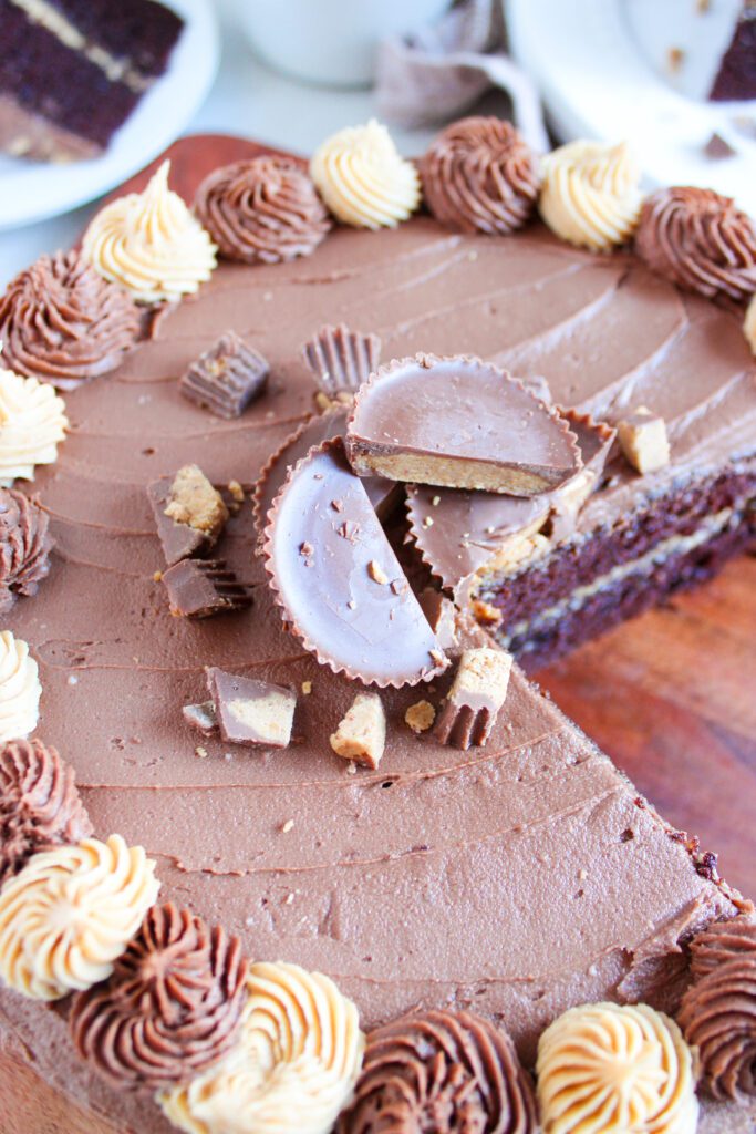 Once the cakes have cooled, whip up the peanut butter frosting and the chocolate-peanut butter frosting. Assemble the layers, frosting generously between each one and all around the cake. Decorate with piping and Reese’s pieces for a stunning finish.