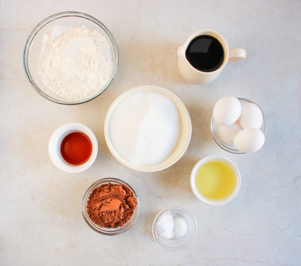 ● Flour, Sugar, Cocoa Powder, Baking Soda, and Salt: The foundation for a moist, flavorful cake.