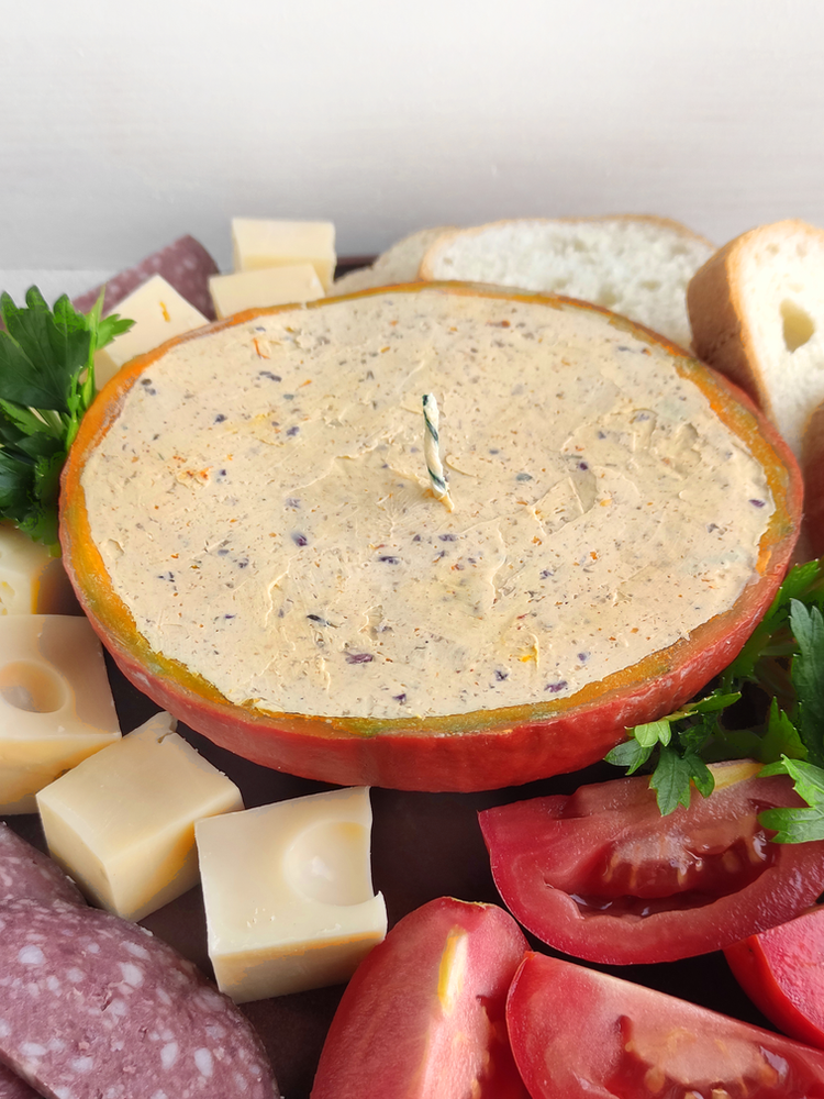 It’s a compound butter, enhanced with caramelized onions, spices, and pumpkin, and served in an organic pumpkin bowl. But here's the twist: add a wick, and it becomes an edible candle! As the candle slowly burns, the softened butter becomes a dip—perfect for pairing with warm bread, crackers, or veggie sticks. This clever creation blends fall flavors with a charming centerpiece, and it’s guaranteed to impress your friends and family.