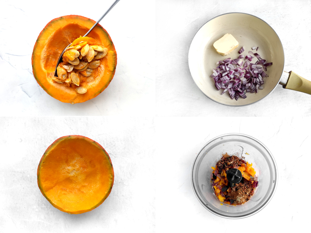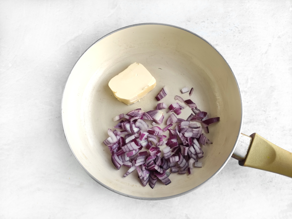 3. Peel the onions and chop finely. Place 1 tsp of butter in a pan and saute until transparent. Add the pumpkin and cook for a couple minutes with constant stirring over medium heat.