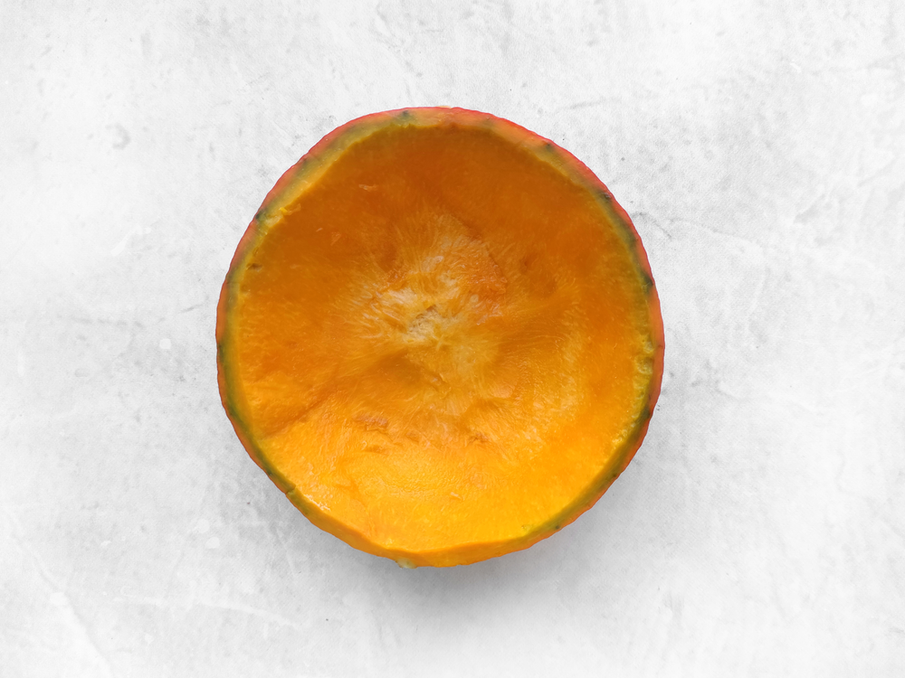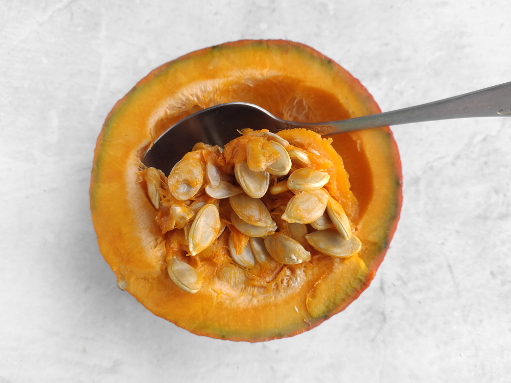 1. Rinse the pumpkin and cut in half. Choose the more stable half. Remove the core and pith.