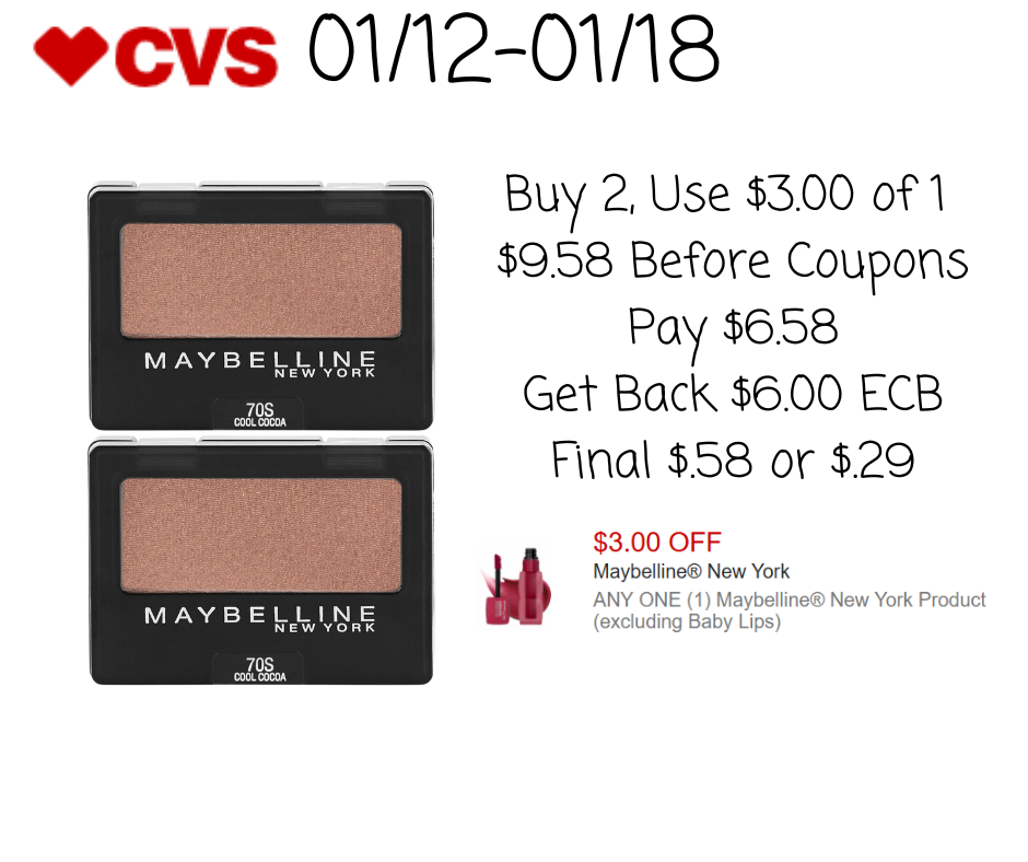 - CVS will reward you with $6 ExtraBucks for purchasing 2 Maybelline cosmetics.