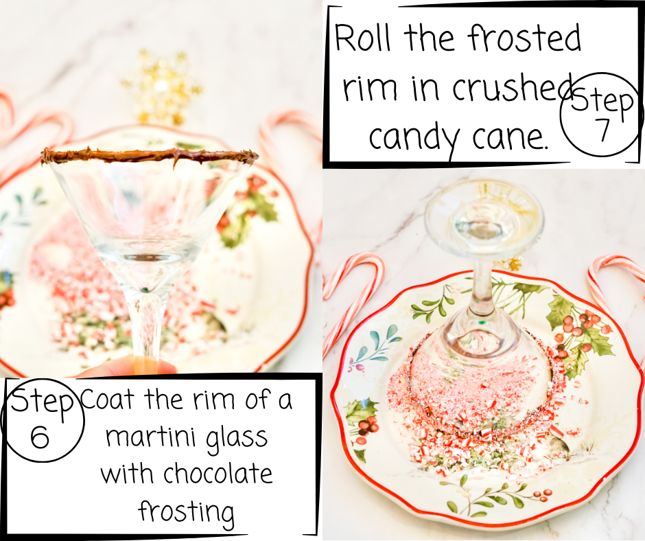 2. Prepare the Rim: Spread a thin layer of chocolate frosting around the rim of a martini glass, then dip it into crushed candy cane for a festive touch.