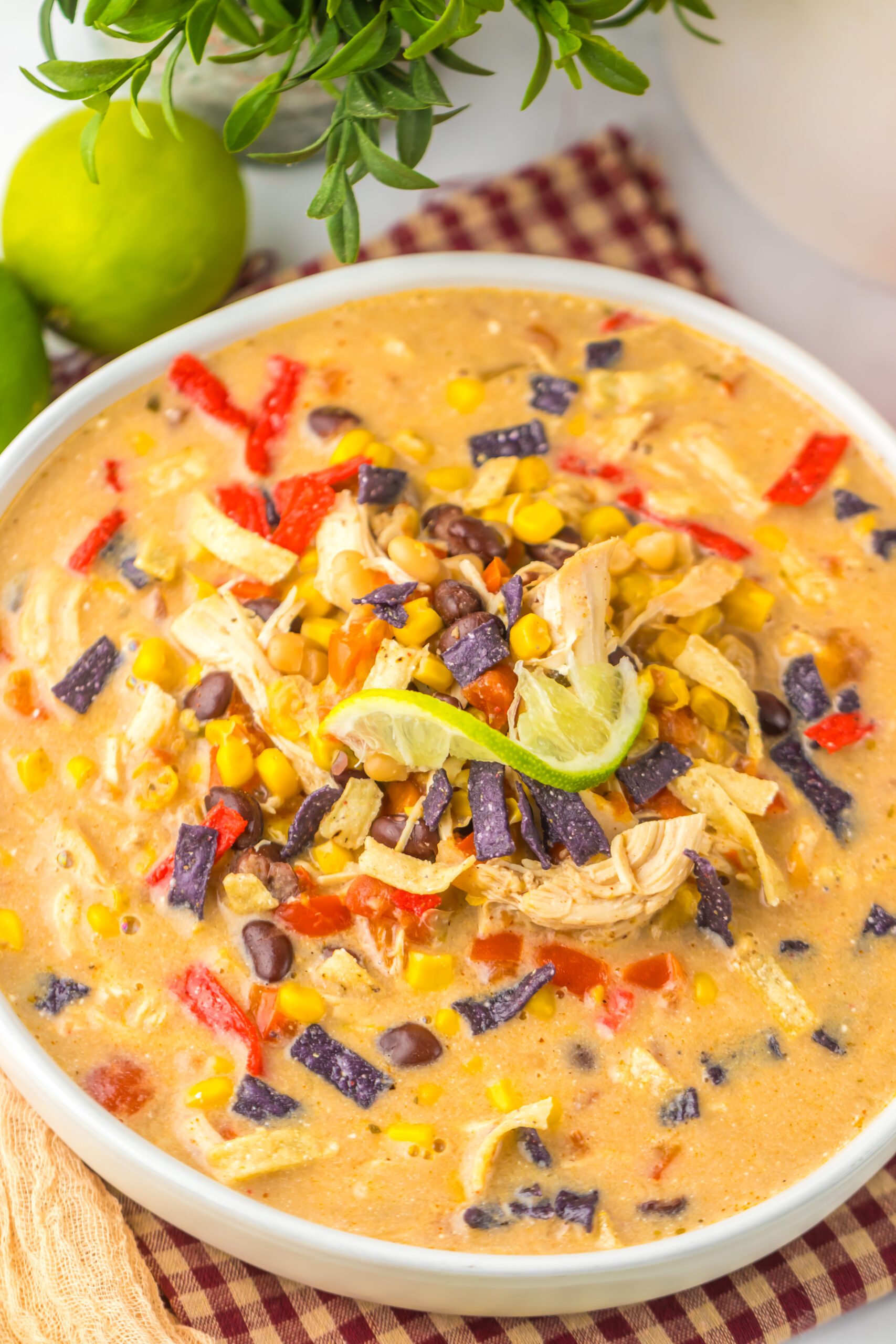 This Slow Cooker Chick Fil a Tortilla Soup hits the spot every time! Full of navy beans, black beans, corn, chicken, onion, red bell pepper, seasonings and finished off with sour cream and heavy cream. Topped with crispy tortilla strips this soup is always a crowd favorite.