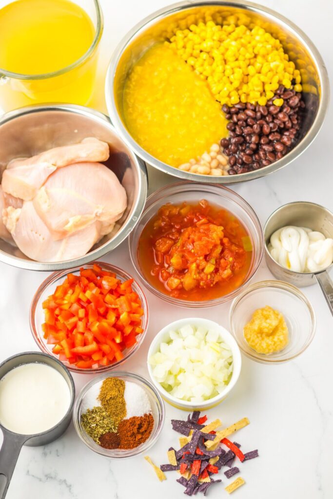 3. Add the Liquid Components: Pour in the tomatoes with green chilies, chicken broth, navy beans, black beans, and both types of corn.