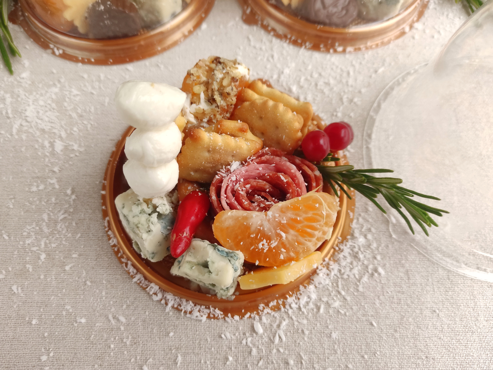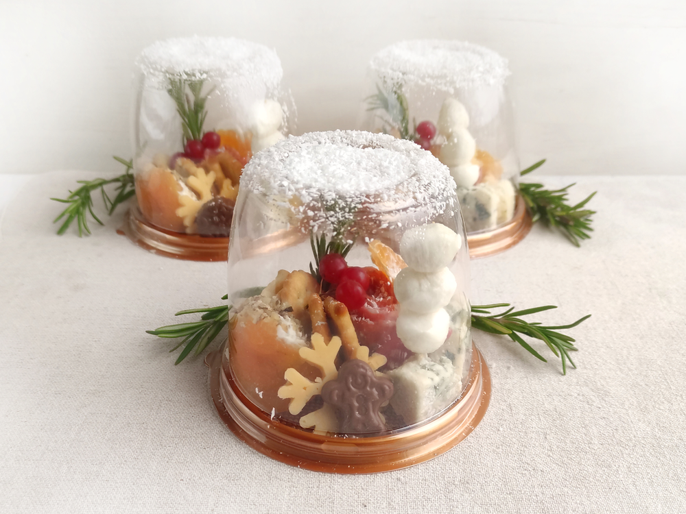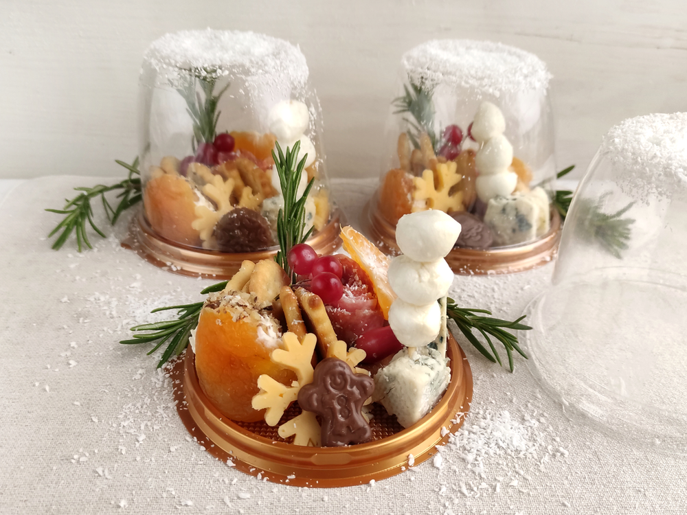 The advantage of this appetizer is that everyone gets their own portion and can move around with it. This is very convenient if your party is in buffet format. In addition, nothing will spoil or get weathered. So you can prepare snow globes in advance and store them in the refrigerator. For the recipe you will need deli meats, cheeses with rich flavor, dried fruits, nuts, chocolate and salty or neutral crackers. For the packaging, we used a dome-shaped disposable cake mold. these molds are sold in stores for pastry chefs.