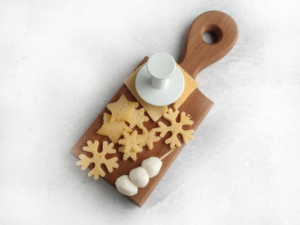 1- Slice hard cheese and cut out snowflakes or stars with cookie cutters. Thread mozzarella onto toothpicks. This is a snowman.