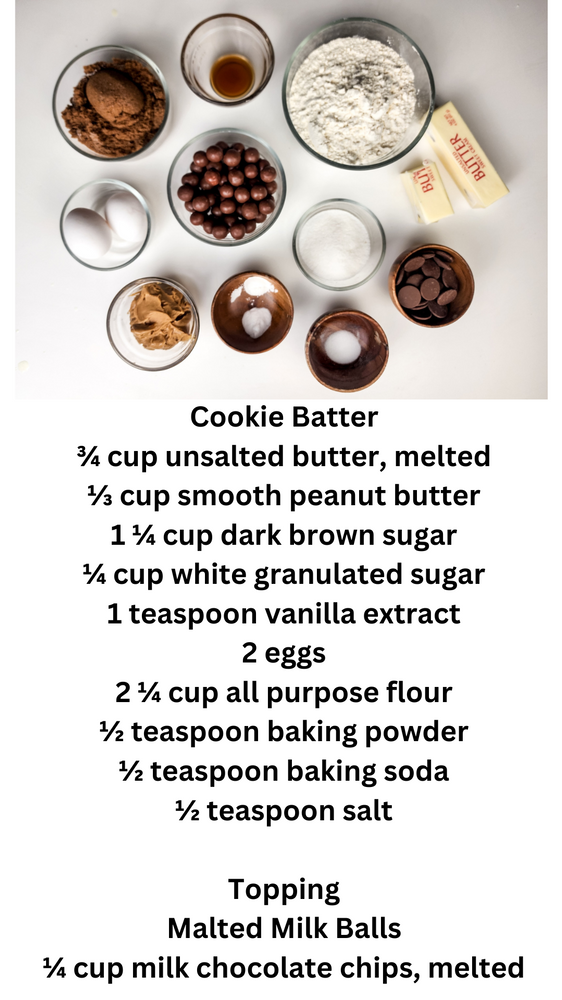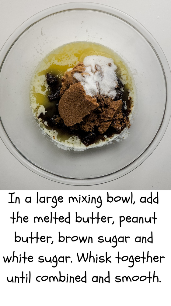 1. In a large mixing bowl, add the melted butter, peanut butter, brown sugar and white sugar. Whisk together until combined and smooth.