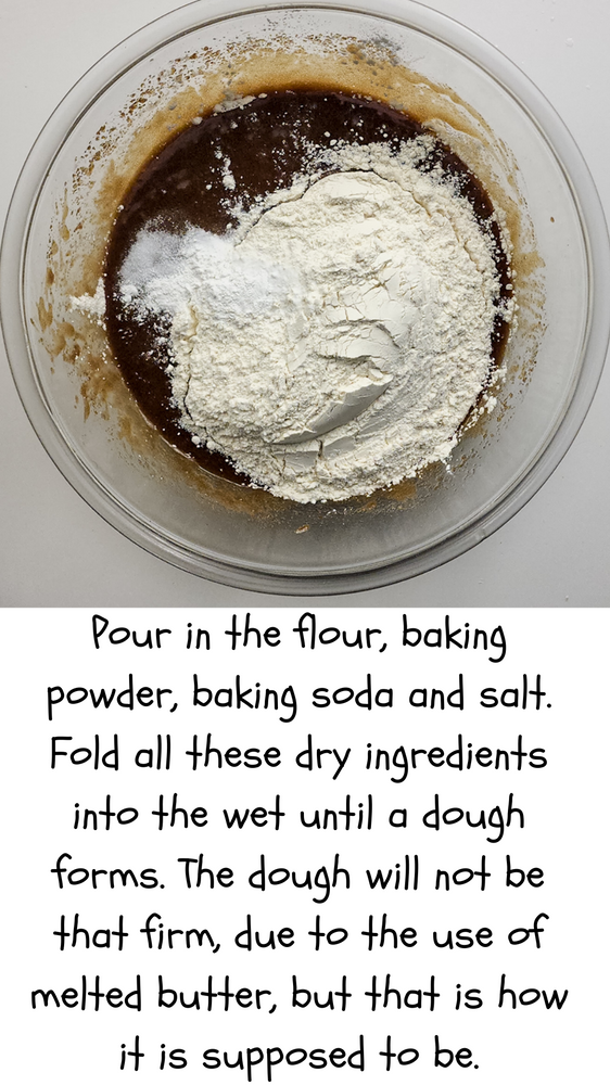 3. Pour in the flour, baking powder, baking soda and salt. Fold all these dry ingredients into the wet until a dough forms. The dough will not be that firm, due to the use of melted butter, but that is how it is supposed to be.