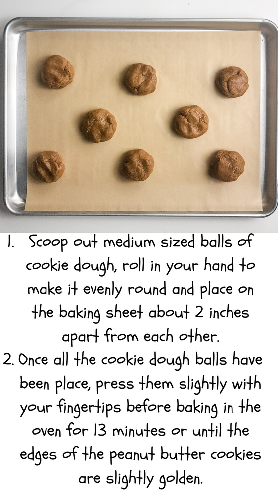 7. Once all the cookie dough balls have been place, press them slightly with your fingertips before baking in the oven for 13 minutes or until the edges of the peanut butter cookies are slightly golden.
