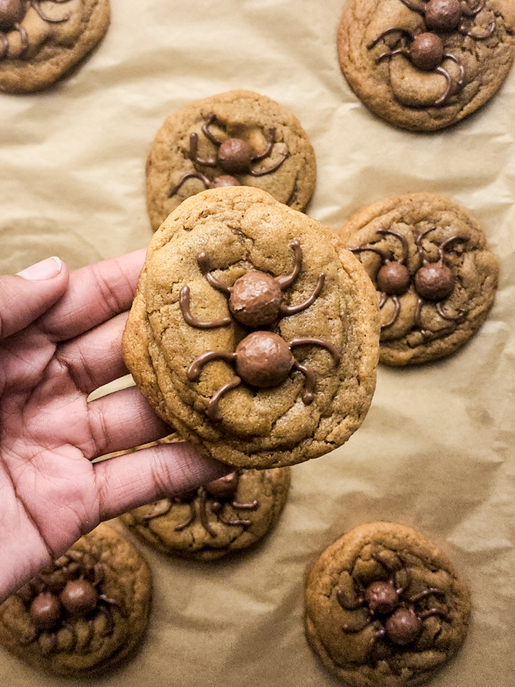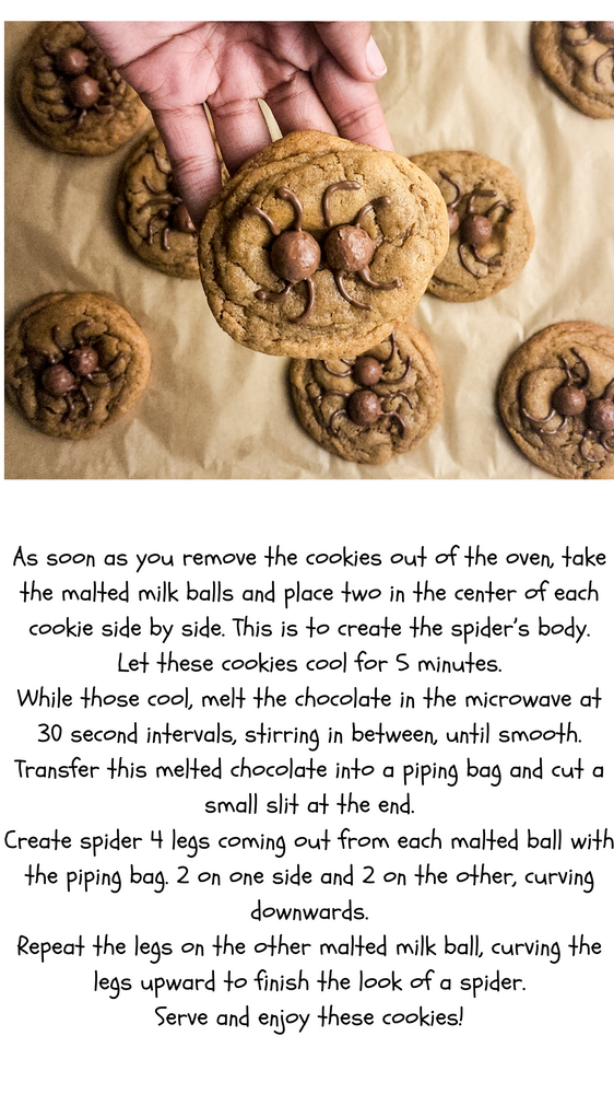 8. As soon as you remove the cookies out of the oven, take the malted milk balls and place two in the center of each cookie side by side. This is to create the spider’s body.