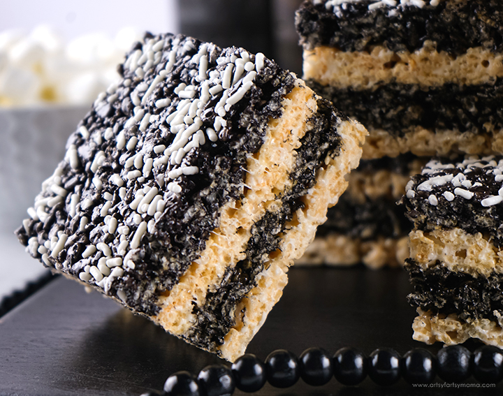 This layered rice krispie treat is a perfect no bake option that brings dark and spooky goodness to snack time. These are so easy for a last minute option that hits the spot with simple goodness.