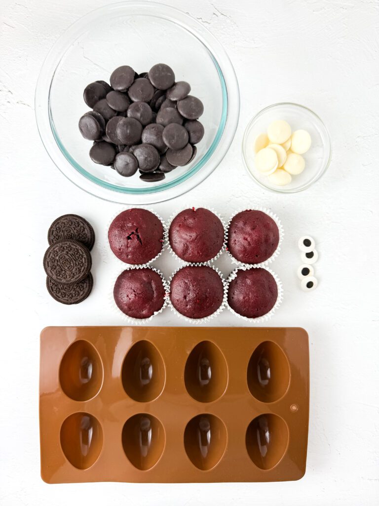 The magic of Bat Truffles comes from a handful of festive ingredients that work together to create flavor, texture, and a spooky appearance. Black chocolate melts provide the deep, dramatic shell that sets the Halloween tone, while a small amount of white chocolate melts add accents for the bat’s teeth and help attach candy eyes. Moist cupcakes, preferably red velvet for that eerie pop of color inside, form the soft, indulgent filling. Chocolate sandwich cookies give these truffles their iconic wings and ears, creating structure and crunch. Finally, candy eyeball sprinkles transform each bite into a fun little creature, making these truffles not just tasty but also delightfully decorative.