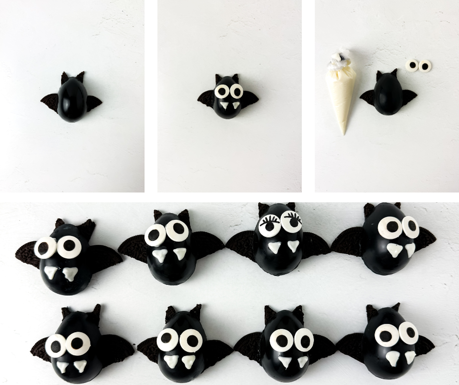 12. -Pipe the white chocolate on the back of the eyeball sprinkles and place them at the top of the bat truffle.